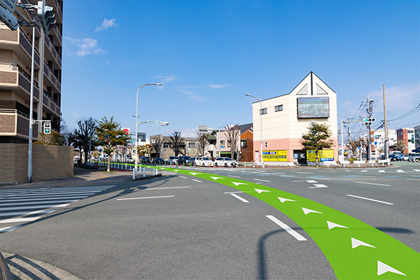 「東新町2丁目」交差点を、北方向(左斜め方向)へ進みます。